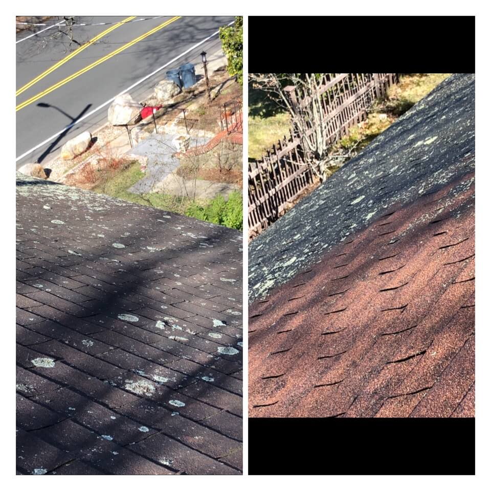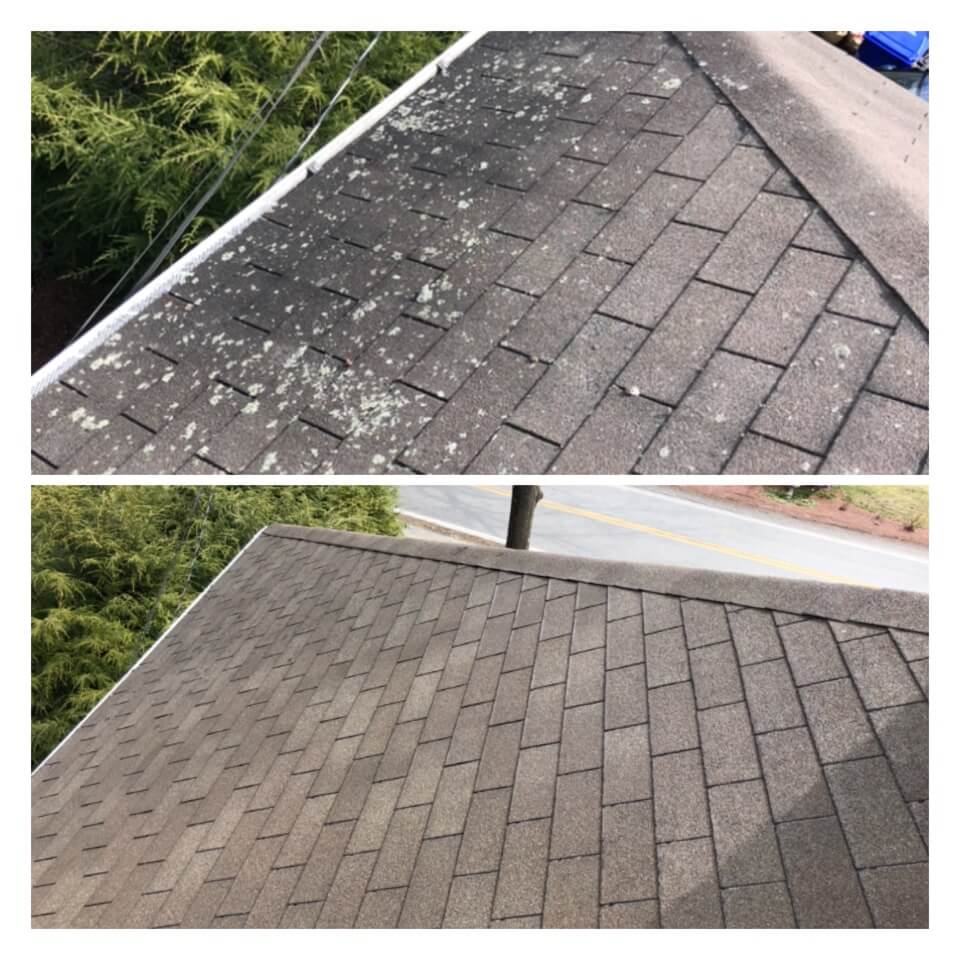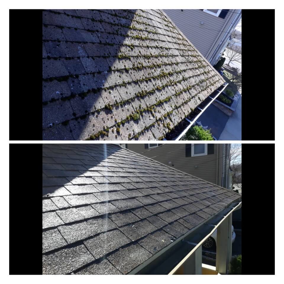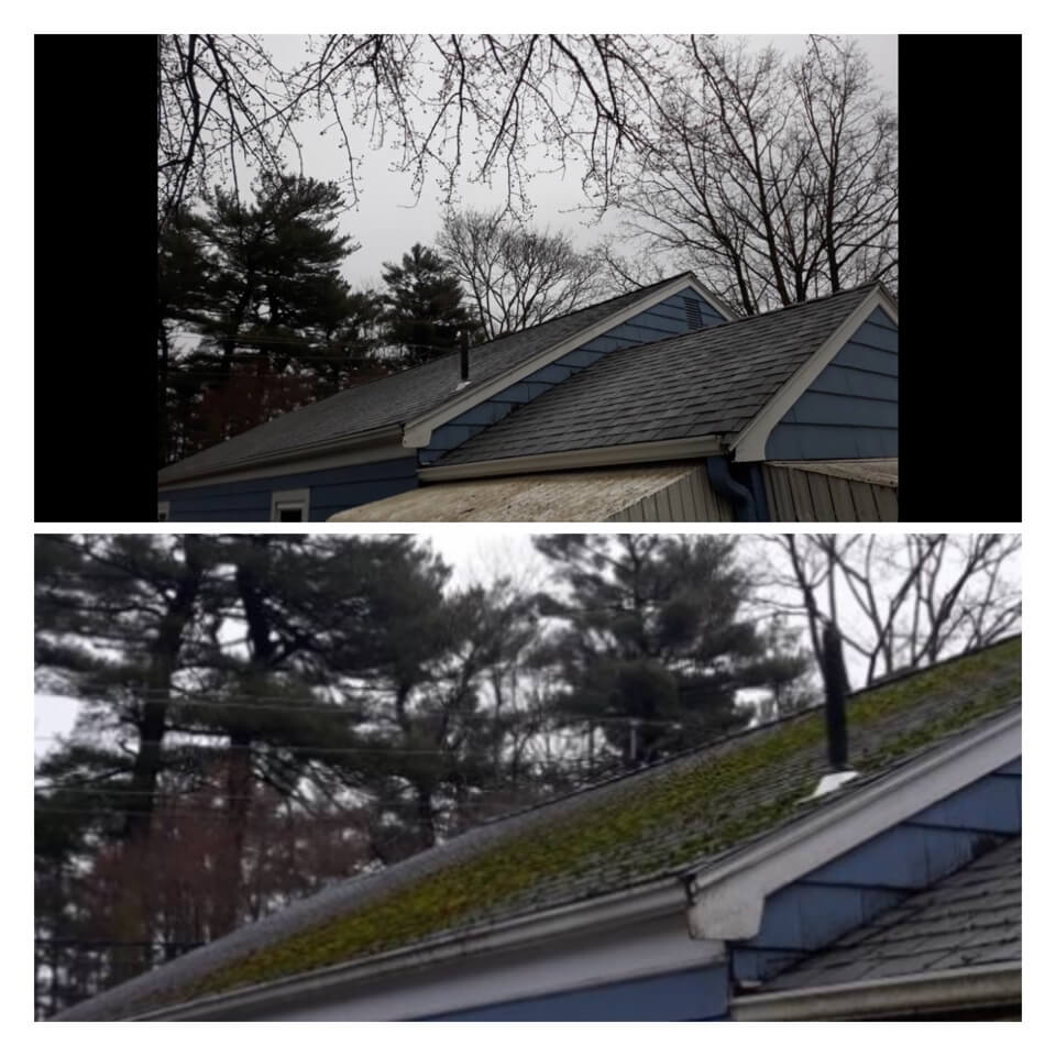 HiCleaners is the most experienced company in Brookline, NH that deals with roof washing and roof soft washing. All of our employees are trained to recognize precise solution mixing ratios to provide you with the safest and most effective soft washing service. Roofs are a commonly neglected part of a house due to the fact that most people don’t have ladders to access it, so it is very easy to just leave it alone and forget about problems that may start to arise. Just like many home owners, discoloration and small bits of moss on a roof can be overlooked because of the misconception that it is just aesthetic. However, it isn’t just aesthetic, the moss slowly lifts the granules off the shingles which in turn shorten the life of the shingle. The moss also spreads, just like any bacteria if it is left alone for too long, it can quickly become a problem that spirals out of control. Call HiCleaners for a free quote, we only use the most advanced eco-friendly solutions and equipment to make sure the job is done right, for the safety of the employees, your plants, grass, pets, and children.